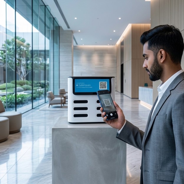 The SafeHaven station is a smart, self-service charging hub designed for public spaces.